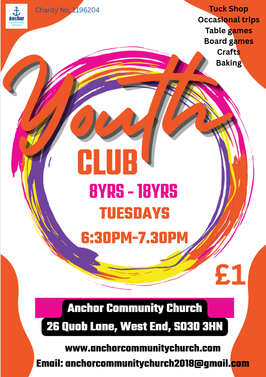 Youth club will run through 2026 fortnightly on Tuesdays (where possible) during term time. However, parents need to sign up to receive the actual dates it is running. All youth aged 8 to 18 are welcome to come. See specific dates below of when we are running this year.